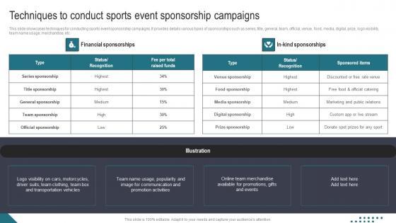 This slide showcases techniques for conducting sports event sponsorship campaigns. It provides details various types of sponsorships such as series, title, general, team, official, venue, food, media, digital, prize, logo visibility, team name usage, merchandise, etc. Whether you have daily or monthly meetings, a brilliant presentation is necessary. Techniques To Conduct Sports Event Athletic Activities Advertising Program Infographics Pdf can be your best option for delivering a presentation. Represent everything in detail using Techniques To Conduct Sports Event Athletic Activities Advertising Program Infographics Pdf and make yourself stand out in meetings. The template is versatile and follows a structure that will cater to your requirements. All the templates prepared by Slidegeeks are easy to download and edit. Our research experts have taken care of the corporate themes as well. So, give it a try and see the results. This slide showcases techniques for conducting sports event sponsorship campaigns. It provides details various types of sponsorships such as series, title, general, team, official, venue, food, media, digital, prize, logo visibility, team name usage, merchandise, etc.