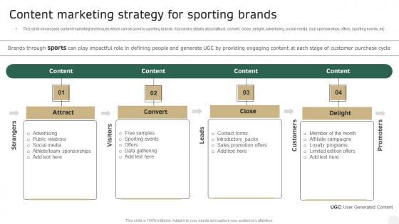 This slide showcases content marketing techniques which can be used by sporting brands. It provides details about attract, convert, close, delight, advertising, social media, club sponsorships, offers, sporting events, etc. If you are looking for a format to display your unique thoughts, then the professionally designed Fitness Product Promotion Campaigns Content Marketing Strategy For Sporting Brands Sample PDF is the one for you. You can use it as a Google Slides template or a PowerPoint template. Incorporate impressive visuals, symbols, images, and other charts. Modify or reorganize the text boxes as you desire. Experiment with shade schemes and font pairings. Alter, share or cooperate with other people on your work. Download Fitness Product Promotion Campaigns Content Marketing Strategy For Sporting Brands Sample PDF and find out how to give a successful presentation. Present a perfect display to your team and make your presentation unforgettable.