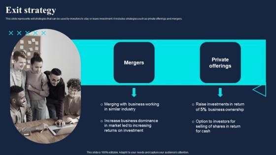 This slide represents exit strategies that can be used by investors to stay or leave investment. it includes strategies such as private offerings and mergers. From laying roadmaps to briefing everything in detail, our templates are perfect for you. You can set the stage with your presentation slides. All you have to do is download these easy to edit and customizable templates. Exit Strategy Gaming Company Fund Raising Pitch Deck Brochure Pdf will help you deliver an outstanding performance that everyone would remember and praise you for. Do download this presentation today. This slide represents exit strategies that can be used by investors to stay or leave investment. it includes strategies such as private offerings and mergers.