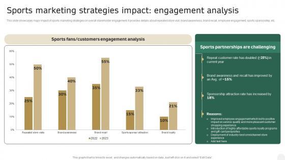This slide showcases major impact of sports marketing strategies on overall stakeholder engagement. It provides details about repeated store visit, brand awareness, brand recall, employee engagement, sports sponsorship, etc. Find a pre-designed and impeccable Integrating Sports Marketing Campaign Sports Marketing Strategies Impact Engagement Analysis Professional PDF. The templates can ace your presentation without additional effort. You can download these easy-to-edit presentation templates to make your presentation stand out from others. So, what are you waiting for Download the template from Slidegeeks today and give a unique touch to your presentation.