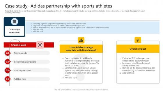 This slide demonstrates an real life example of Adidas partnership strategy through a marketing campaign. It includes campaign overview, strategies involved, channel used and impact of campaign on overall company performance. Here you can discover an assortment of the finest PowerPoint and Google Slides templates. With these templates, you can create presentations for a variety of purposes while simultaneously providing your audience with an eye-catching visual experience. Download The Marketing Mix Of Case Study Adidas Partnership With Sports Athletes Strategy SS V to deliver an impeccable presentation. These templates will make your job of preparing presentations much quicker, yet still, maintain a high level of quality. Slidegeeks has experienced researchers who prepare these templates and write high-quality content for you. Later on, you can personalize the content by editing the The Marketing Mix Of Case Study Adidas Partnership With Sports Athletes Strategy SS V. This slide demonstrates an real life example of Adidas partnership strategy through a marketing campaign. It includes campaign overview, strategies involved, channel used and impact of campaign on overall company performance.