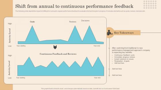 The following slide depicts the impact of shifting from annual to regular performance feedback to evaluate short and long term progress. It includes elements such as goals, reviews, decisions etc. Do you know about Slidesgeeks Shift From Annual To Continuous Performance Executing Successful Staff Performance Designs Pdf These are perfect for delivering any kind od presentation. Using it, create PowerPoint presentations that communicate your ideas and engage audiences. Save time and effort by using our pre designed presentation templates that are perfect for a wide range of topic. Our vast selection of designs covers a range of styles, from creative to business, and are all highly customizable and easy to edit. Download as a PowerPoint template or use them as Google Slides themes. The following slide depicts the impact of shifting from annual to regular performance feedback to evaluate short and long term progress. It includes elements such as goals, reviews, decisions etc.