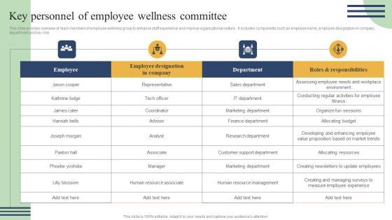 This slide provides overview of team members of employee wellness group to enhance staff experience and improve organizational culture . It includes components such as employee name, employee designation in company, department and key role. The best PPT templates are a great way to save time, energy, and resources. Slidegeeks have 100 percent editable powerpoint slides making them incredibly versatile. With these quality presentation templates, you can create a captivating and memorable presentation by combining visually appealing slides and effectively communicating your message. Download Action Measures To Build Staff Key Personnel Of Employee Wellness Committee Brochure Pdf from Slidegeeks and deliver a wonderful presentation. This slide provides overview of team members of employee wellness group to enhance staff experience and improve organizational culture . It includes components such as employee name, employee designation in company, department and key role.