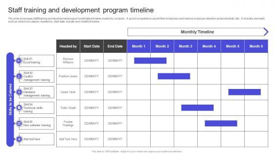 The slide showcases staff training and development programs estimated timeline created by company . It assist companies to upskill their employees and improve employee retention and productivity rate . It includes elements such as skills to be catered, headed by, start date, end ate and monthly timeline, Do you know about Slidesgeeks Strategies To Build Meaningful Staff Training And Development Program Timeline Graphics PDF These are perfect for delivering any kind od presentation. Using it, create PowerPoint presentations that communicate your ideas and engage audiences. Save time and effort by using our pre-designed presentation templates that are perfect for a wide range of topic. Our vast selection of designs covers a range of styles, from creative to business, and are all highly customizable and easy to edit. Download as a PowerPoint template or use them as Google Slides themes. The slide showcases staff training and development programs estimated timeline created by company . It assist companies to upskill their employees and improve employee retention and productivity rate . It includes elements such as skills to be catered, headed by, start date, end ate and monthly timeline,