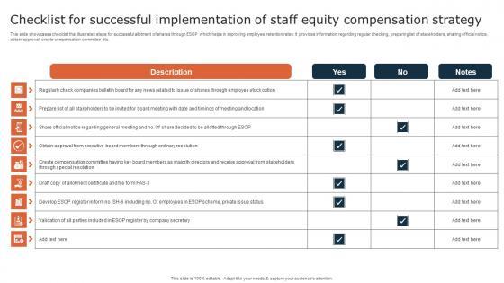 This slide showcases checklist that illustrates steps for successful allotment of shares through ESOP which helps in improving employee retention rates. It provides information regarding regular checking, preparing list of stakeholders, sharing official notice, obtain approval, create compensation committee etc. Showcasing this set of slides titled Checklist For Successful Implementation Of Staff Equity Compensation Strategy Graphics Pdf. The topics addressed in these templates are Successful Implementation, Staff Equity, Compensation Strategy. All the content presented in this PPT design is completely editable. Download it and make adjustments in color, background, font etc. as per your unique business setting. This slide showcases checklist that illustrates steps for successful allotment of shares through ESOP which helps in improving employee retention rates. It provides information regarding regular checking, preparing list of stakeholders, sharing official notice, obtain approval, create compensation committee etc.