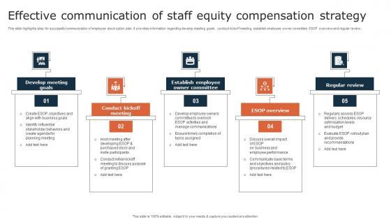 This slide highlights step for successful communication of employee stock option plan. It provides information regarding develop meeting goals , conduct kickoff meeting, establish employee owner committee, ESOP overview and regular review. Showcasing this set of slides titled Effective Communication Of Staff Equity Compensation Strategy Inspiration Pdf. The topics addressed in these templates are Develop Meeting Goals, Conduct Kickoff Meeting. All the content presented in this PPT design is completely editable. Download it and make adjustments in color, background, font etc. as per your unique business setting. This slide highlights step for successful communication of employee stock option plan. It provides information regarding develop meeting goals , conduct kickoff meeting, establish employee owner committee, ESOP overview and regular review.
