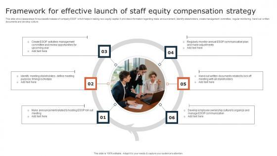 This slide showcases steps for successful release of company ESOP which helps in raising new equity capital. It provides information regarding make announcement, identify stakeholders, create management committee, regular monitoring, hand out written documents and develop culture. Pitch your topic with ease and precision using this Framework For Effective Launch Of Staff Equity Compensation Strategy Inspiration Pdf. This layout presents information on Review Opportunities, Define Meeting, Adjustments. It is also available for immediate download and adjustment. So, changes can be made in the color, design, graphics or any other component to create a unique layout. This slide showcases steps for successful release of company ESOP which helps in raising new equity capital. It provides information regarding make announcement, identify stakeholders, create management committee, regular monitoring, hand out written documents and develop culture.