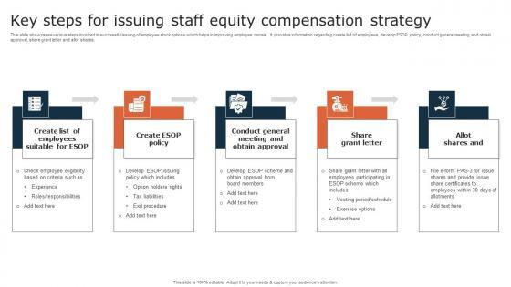 This slide showcases various steps involved in successful issuing of employee stock options which helps in improving employee morale . It provides information regarding create list of employees, develop ESOP policy, conduct general meeting and obtain approval, share grant letter and allot shares. Pitch your topic with ease and precision using this Key Steps For Issuing Staff Equity Compensation Strategy Graphics Pdf. This layout presents information on Conduct General, Share Grant Letter, Allot Shares. It is also available for immediate download and adjustment. So, changes can be made in the color, design, graphics or any other component to create a unique layout. This slide showcases various steps involved in successful issuing of employee stock options which helps in improving employee morale . It provides information regarding create list of employees, develop ESOP policy, conduct general meeting and obtain approval, share grant letter and allot shares.