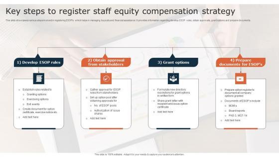 This slide showcases various steps involved in registering ESOPs which helps in managing buyouts and financial assistance. It provides information regarding develop ESOP rules, obtain approvals, grant options and prepare documents. Showcasing this set of slides titled Key Steps To Register Staff Equity Compensation Strategy Rules Pdf. The topics addressed in these templates are Obtain Approval, Grant Options, Prepare Documents. All the content presented in this PPT design is completely editable. Download it and make adjustments in color, background, font etc. as per your unique business setting. This slide showcases various steps involved in registering ESOPs which helps in managing buyouts and financial assistance. It provides information regarding develop ESOP rules, obtain approvals, grant options and prepare documents.
