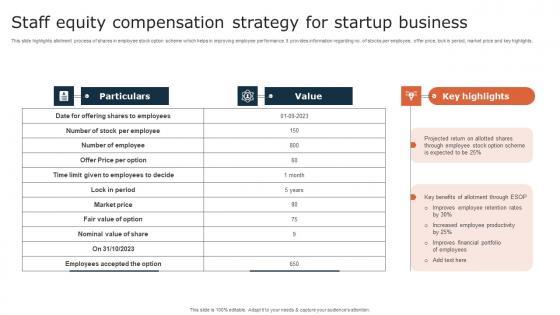 This slide highlights allotment process of shares in employee stock option scheme which helps in improving employee performance. It provides information regarding no. of stocks per employee, offer price, lock in period, market price and key highlights. Showcasing this set of slides titled Staff Equity Compensation Strategy For Startup Business Background Pdf. The topics addressed in these templates are Particulars, Value. All the content presented in this PPT design is completely editable. Download it and make adjustments in color, background, font etc. as per your unique business setting. This slide highlights allotment process of shares in employee stock option scheme which helps in improving employee performance. It provides information regarding no. of stocks per employee, offer price, lock in period, market price and key highlights.