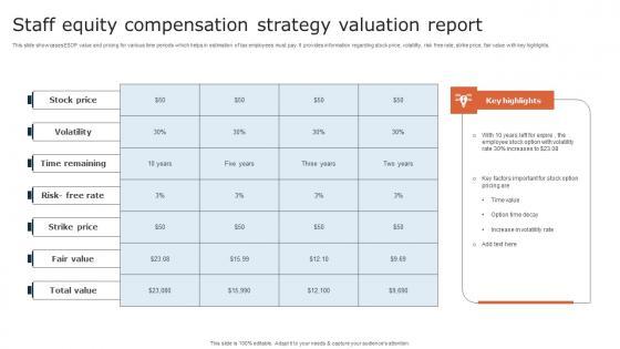 This slide showcases ESOP value and pricing for various time periods which helps in estimation of tax employees must pay. It provides information regarding stock price, volatility, risk free rate, strike price, fair value with key highlights. Pitch your topic with ease and precision using this Staff Equity Compensation Strategy Valuation Report Formats Pdf. This layout presents information on Stock Price, Volatility, Time Remaining. It is also available for immediate download and adjustment. So, changes can be made in the color, design, graphics or any other component to create a unique layout. This slide showcases ESOP value and pricing for various time periods which helps in estimation of tax employees must pay. It provides information regarding stock price, volatility, risk free rate, strike price, fair value with key highlights.