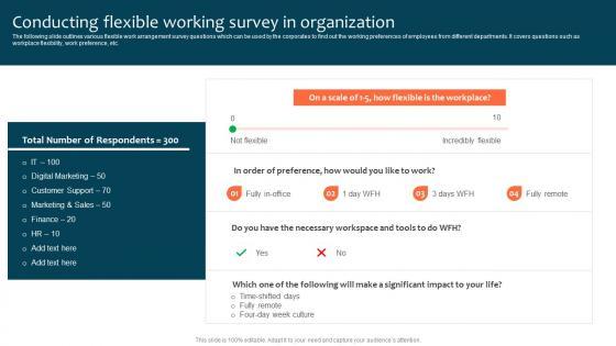 The following slide outlines various flexible work arrangement survey questions which can be used by the corporates to find out the working preferences of employees from different departments. It covers questions such as workplace flexibility, work preference, etc. Make sure to capture your audiences attention in your business displays with our gratis customizable Organising Staff Flexible Job Arrangements Conducting Flexible Working Survey In Organization Designs PDF. These are great for business strategies, office conferences, capital raising or task suggestions. If you desire to acquire more customers for your tech business and ensure they stay satisfied, create your own sales presentation with these plain slides.