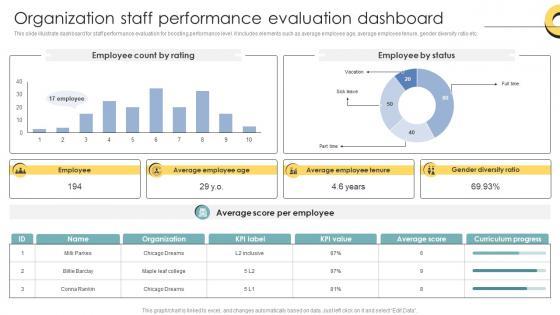 This slide illustrate dashboard for staff performance evaluation for boosting performance level. it includes elements such as average employee age, average employee tenure, gender diversity ratio etc. Slidegeeks is here to make your presentations a breeze with Skill Enhancement Performance Organization Staff Performance Evaluation Dashboard With our easy-to-use and customizable templates, you can focus on delivering your ideas rather than worrying about formatting. With a variety of designs to choose from, you are sure to find one that suits your needs. And with animations and unique photos, illustrations, and fonts, you can make your presentation pop. So whether you are giving a sales pitch or presenting to the board, make sure to check out Slidegeeks first This slide illustrate dashboard for staff performance evaluation for boosting performance level. it includes elements such as average employee age, average employee tenure, gender diversity ratio etc.