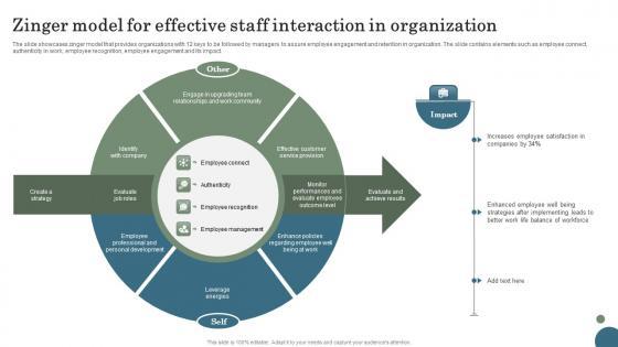The slide showcases zinger model that provides organizations with 12 keys to be followed by managers to assure employee engagement and retention in organization. The slide contains elements such as employee connect, authenticity in work, employee recognition, employee engagement and its impact. Showcasing this set of slides titled Zinger Model For Effective Staff Interaction In Organization Template Pdf The topics addressed in these templates are Identify With Company, Personal Development, Leverage Energies All the content presented in this PPT design is completely editable. Download it and make adjustments in color, background, font etc. as per your unique business setting. The slide showcases zinger model that provides organizations with 12 keys to be followed by managers to assure employee engagement and retention in organization. The slide contains elements such as employee connect, authenticity in work, employee recognition, employee engagement and its impact.