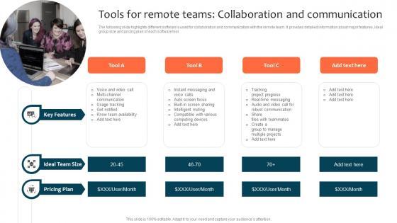 The following slide highlights different softwares used for collaboration and communication with the remote team. It provides detailed information about major features, ideal group size and pricing plan of each software tool. If you are looking for a format to display your unique thoughts, then the professionally designed Tools For Remote Teams Collaboration And Communication Optimizing Staff Retention Rate Clipart Pdf is the one for you. You can use it as a Google Slides template or a PowerPoint template. Incorporate impressive visuals, symbols, images, and other charts. Modify or reorganize the text boxes as you desire. Experiment with shade schemes and font pairings. Alter, share or cooperate with other people on your work. Download Tools For Remote Teams Collaboration And Communication Optimizing Staff Retention Rate Clipart Pdf and find out how to give a successful presentation. Present a perfect display to your team and make your presentation unforgettable. The following slide highlights different softwares used for collaboration and communication with the remote team. It provides detailed information about major features, ideal group size and pricing plan of each software tool.