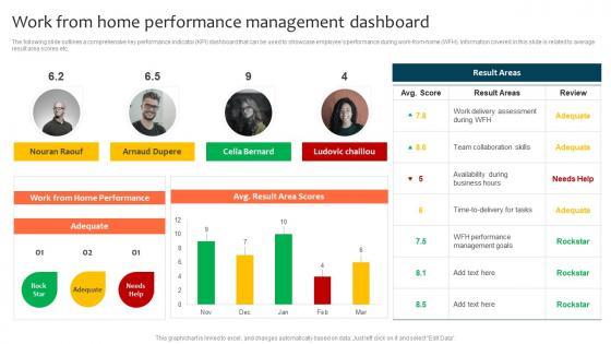 The following slide outlines a comprehensive key performance indicator KPI dashboard that can be used to showcase employees performance during work-from-home WFH. Information covered in this slide is related to average result area scores etc. This Work From Home Performance Management Dashboard Optimizing Staff Retention Rate Topics Pdf is perfect for any presentation, be it in front of clients or colleagues. It is a versatile and stylish solution for organizing your meetings. The Work From Home Performance Management Dashboard Optimizing Staff Retention Rate Topics Pdf features a modern design for your presentation meetings. The adjustable and customizable slides provide unlimited possibilities for acing up your presentation. Slidegeeks has done all the homework before launching the product for you. So, do not wait, grab the presentation templates today The following slide outlines a comprehensive key performance indicator KPI dashboard that can be used to showcase employees performance during work-from-home WFH. Information covered in this slide is related to average result area scores etc.