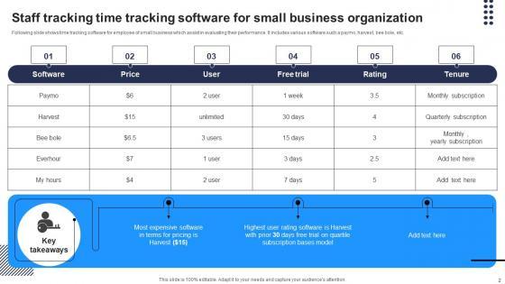 Following slide shows time tracking software for employee of small business which assist in evaluating their performance. It includes various software such a paymo, harvest, bee bole, etc. Showcasing this set of slides titled Staff Tracking Time Tracking Software For Small Business Organization Structure Pdf The topics addressed in these templates are Software, Staff Tracking, Business Organization All the content presented in this PPT design is completely editable. Download it and make adjustments in color, background, font etc. as per your unique business setting. Following slide shows time tracking software for employee of small business which assist in evaluating their performance. It includes various software such a paymo, harvest, bee bole, etc.