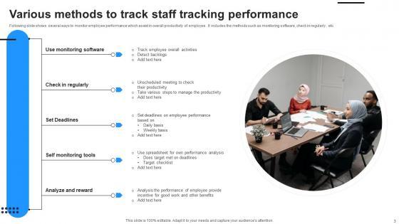 Following slide shows several ways to monitor employee performance which assist in overall productivity of employee. It includes the methods such as monitoring software, check in regularly , etc. Pitch your topic with ease and precision using this Various Methods To Track Staff Tracking Performance Slides Pdf This layout presents information on Monitoring Software, Check In Regularly, Self Monitoring Tools It is also available for immediate download and adjustment. So, changes can be made in the color, design, graphics or any other component to create a unique layout. Following slide shows several ways to monitor employee performance which assist in overall productivity of employee. It includes the methods such as monitoring software, check in regularly , etc.