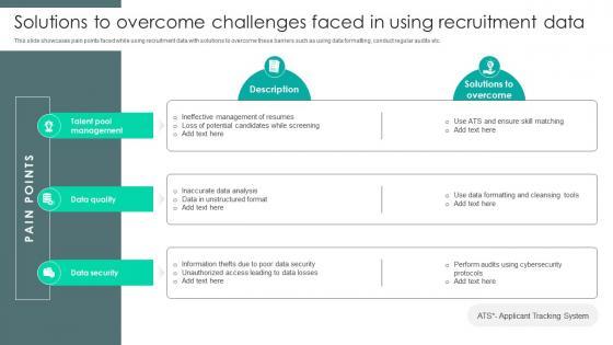 This slide showcases pain points faced while using recruitment data with solutions to overcome these barriers such as using data formatting, conduct regular audits etc. Want to ace your presentation in front of a live audience Our Strategic Staffing Using Data Solutions To Overcome Challenges Faced In Using CRP DK SS V can help you do that by engaging all the users towards you. Slidegeeks experts have put their efforts and expertise into creating these impeccable powerpoint presentations so that you can communicate your ideas clearly. Moreover, all the templates are customizable, and easy-to-edit and downloadable. Use these for both personal and commercial use. This slide showcases pain points faced while using recruitment data with solutions to overcome these barriers such as using data formatting, conduct regular audits etc.