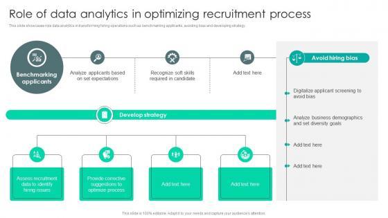 This slide showcases role data analytics in transforming hiring operations such as benchmarking applicants, avoiding bias and developing strategy. Slidegeeks is one of the best resources for PowerPoint templates. You can download easily and regulate Strategic Staffing Using Data Role Of Data Analytics In Optimizing Recruitment CRP DK SS V for your personal presentations from our wonderful collection. A few clicks is all it takes to discover and get the most relevant and appropriate templates. Use our Templates to add a unique zing and appeal to your presentation and meetings. All the slides are easy to edit and you can use them even for advertisement purposes. This slide showcases role data analytics in transforming hiring operations such as benchmarking applicants, avoiding bias and developing strategy.