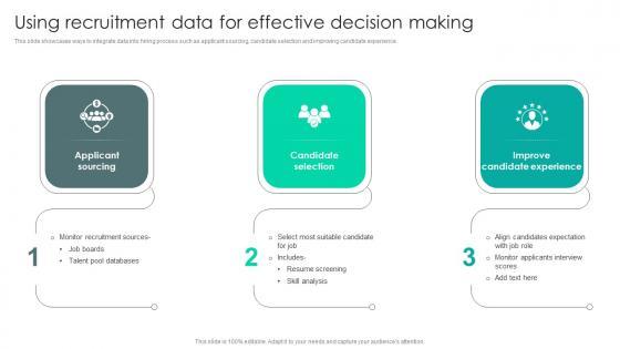 This slide showcases ways to integrate data into hiring process such as applicant sourcing, candidate selection and improving candidate experience. Do you have an important presentation coming up Are you looking for something that will make your presentation stand out from the rest Look no further than Strategic Staffing Using Data Using Recruitment Data For Effective Decision Making CRP DK SS V. With our professional designs, you can trust that your presentation will pop and make delivering it a smooth process. And with Slidegeeks, you can trust that your presentation will be unique and memorable. So why wait Grab Strategic Staffing Using Data Using Recruitment Data For Effective Decision Making CRP DK SS V today and make your presentation stand out from the rest This slide showcases ways to integrate data into hiring process such as applicant sourcing, candidate selection and improving candidate experience.