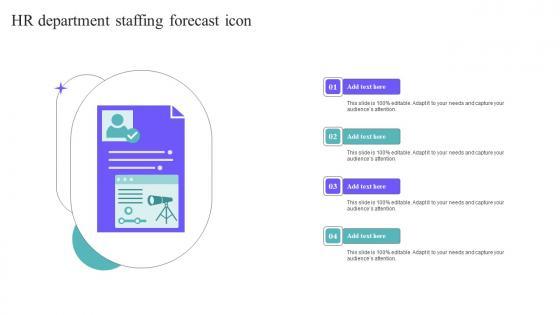Pitch your topic with ease and precision using this HR Department Staffing Forecast Icon Mockup Pdf. This layout presents information on HR Department, Staffing Forecast Icon. It is also available for immediate download and adjustment. So, changes can be made in the color, design, graphics or any other component to create a unique layout. Our HR Department Staffing Forecast Icon Mockup Pdf are topically designed to provide an attractive backdrop to any subject. Use them to look like a presentation pro.