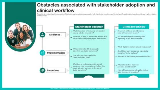 This slide describes the clinical adoption of digital biomarkers obstacles associated with stakeholder incentives and clinical workflow integration based on evidence, implementation, and incentives. The Obstacles Associated With Stakeholder Digital Biomarkers For Personalized Health Insights Diagrams Pdf is a compilation of the most recent design trends as a series of slides. It is suitable for any subject or industry presentation, containing attractive visuals and photo spots for businesses to clearly express their messages. This template contains a variety of slides for the user to input data, such as structures to contrast two elements, bullet points, and slides for written information. Slidegeeks is prepared to create an impression. This slide describes the clinical adoption of digital biomarkers obstacles associated with stakeholder incentives and clinical workflow integration based on evidence, implementation, and incentives.