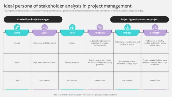 Following slide exhibits stakeholder analysis for construction project that helps to organize and determine key stakeholders. It includes elements such as names, role, priorities, impact and strategy. Make sure to capture your audiences attention in your business displays with our gratis customizable Project Stakeholders Management Ideal Persona Of Stakeholder Analysis In Ppt Slide. These are great for business strategies, office conferences, capital raising or task suggestions. If you desire to acquire more customers for your tech business and ensure they stay satisfied, create your own sales presentation with these plain slides. Following slide exhibits stakeholder analysis for construction project that helps to organize and determine key stakeholders. It includes elements such as names, role, priorities, impact and strategy.