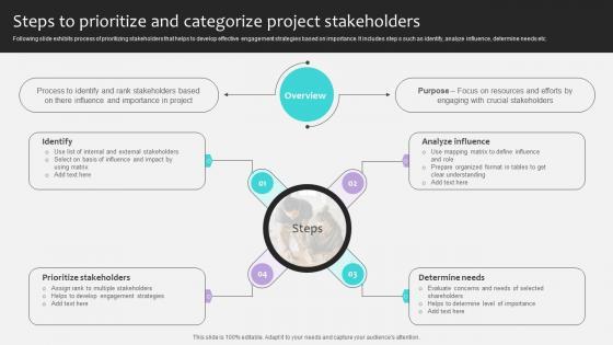 Following slide exhibits process of prioritizing stakeholders that helps to develop effective engagement strategies based on importance. It includes step s such as identify, analyze influence, determine needs etc. This Project Stakeholders Management Steps To Prioritize And Categorize Project Ppt Sample from Slidegeeks makes it easy to present information on your topic with precision. It provides customization options, so you can make changes to the colors, design, graphics, or any other component to create a unique layout. It is also available for immediate download, so you can begin using it right away. Slidegeeks has done good research to ensure that you have everything you need to make your presentation stand out. Make a name out there for a brilliant performance. Following slide exhibits process of prioritizing stakeholders that helps to develop effective engagement strategies based on importance. It includes step s such as identify, analyze influence, determine needs etc.