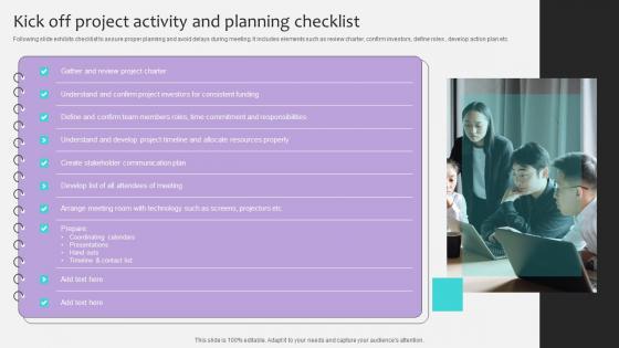 Following slide exhibits checklist to assure proper planning and avoid delays during meeting. It includes elements such as review charter, confirm investors, define roles , develop action plan etc. Retrieve professionally designed Project Stakeholders Management Kick Off Project Activity And Planning Ppt Powerpoint to effectively convey your message and captivate your listeners. Save time by selecting pre-made slideshows that are appropriate for various topics, from business to educational purposes. These themes come in many different styles, from creative to corporate, and all of them are easily adjustable and can be edited quickly. Access them as PowerPoint templates or as Google Slides themes. You do not have to go on a hunt for the perfect presentation because Slidegeeks got you covered from everywhere. Following slide exhibits checklist to assure proper planning and avoid delays during meeting. It includes elements such as review charter, confirm investors, define roles , develop action plan etc.