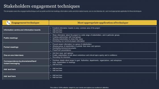 This template covers the engagement technique such as public and formal meetings, information centre and information boards, one on one interview etc. and most appropriate application for these techniques The best PPT templates are a great way to save time, energy, and resources. Slidegeeks have 100 percent editable powerpoint slides making them incredibly versatile. With these quality presentation templates, you can create a captivating and memorable presentation by combining visually appealing slides and effectively communicating your message. Download Stakeholders Engagement Techniques Critical Incident Communication Ideas Pdf from Slidegeeks and deliver a wonderful presentation. This template covers the engagement technique such as public and formal meetings, information centre and information boards, one on one interview etc. and most appropriate application for these techniques