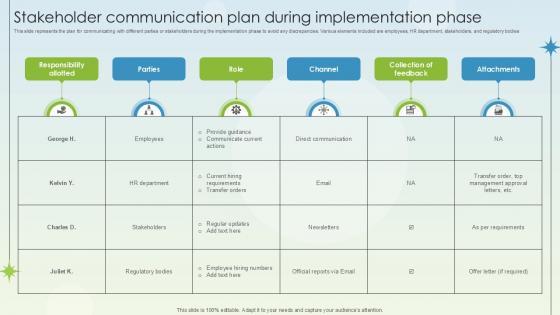 This slide represents the plan for communicating with different parties or stakeholders during the implementation phase to avoid any discrepancies. Various elements included are employees, HR department, stakeholders, and regulatory bodies Slidegeeks is one of the best resources for PowerPoint templates. You can download easily and regulate Stakeholder Communication Plan During Implementation Phase Business Growth Ppt Template for your personal presentations from our wonderful collection. A few clicks is all it takes to discover and get the most relevant and appropriate templates. Use our Templates to add a unique zing and appeal to your presentation and meetings. All the slides are easy to edit and you can use them even for advertisement purposes. This slide represents the plan for communicating with different parties or stakeholders during the implementation phase to avoid any discrepancies. Various elements included are employees, HR department, stakeholders, and regulatory bodies