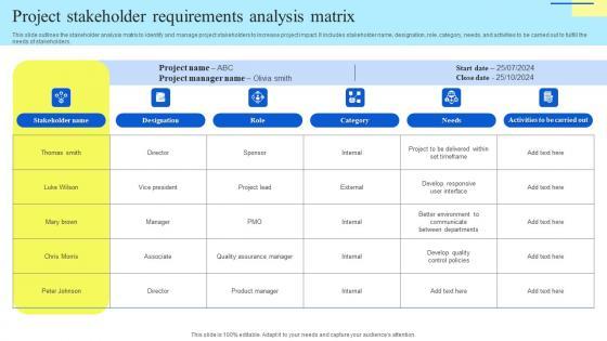 This slide outlines the stakeholder analysis matrix to identify and manage project stakeholders to increase project impact. It includes stakeholder name, designation, role, category, needs, and activities to be carried out to fulfill the needs of stakeholders. Showcasing this set of slides titled Project Stakeholder Requirements Analysis Matrix Template Pdf. The topics addressed in these templates are Project Stakeholder, Requirements Analysis Matrix, Stakeholder Analysis Matrix. All the content presented in this PPT design is completely editable. Download it and make adjustments in color, background, font etc. as per your unique business setting. This slide outlines the stakeholder analysis matrix to identify and manage project stakeholders to increase project impact. It includes stakeholder name, designation, role, category, needs, and activities to be carried out to fulfill the needs of stakeholders.