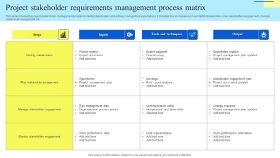 This slide includes the project stakeholders management process to identify stakeholders and actively manage their expectations. It includes four processes such as identify stakeholders, plan stakeholders engagement, manage stakeholder engagement, etc. Showcasing this set of slides titled Project Stakeholder Requirements Management Process Matrix Download Pdf. The topics addressed in these templates are Plan Stakeholder Engagement, Manage Stakeholder Engagement, Monitor Stakeholder Engagement. All the content presented in this PPT design is completely editable. Download it and make adjustments in color, background, font etc. as per your unique business setting. This slide includes the project stakeholders management process to identify stakeholders and actively manage their expectations. It includes four processes such as identify stakeholders, plan stakeholders engagement, manage stakeholder engagement, etc.