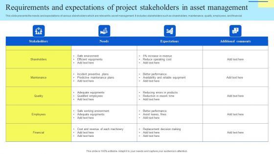 This slide presents the needs and expectations of various stakeholders which are relevant to asset management. It includes stakeholders such as shareholders, maintenance, quality, employees, and financial. Showcasing this set of slides titled Requirements And Expectations Of Project Stakeholders In Asset Management Themes Pdf. The topics addressed in these templates are Safe Environment, Efficient Equipments, Safe Working Environment, Adequate Equipments. All the content presented in this PPT design is completely editable. Download it and make adjustments in color, background, font etc. as per your unique business setting. This slide presents the needs and expectations of various stakeholders which are relevant to asset management. It includes stakeholders such as shareholders, maintenance, quality, employees, and financial.