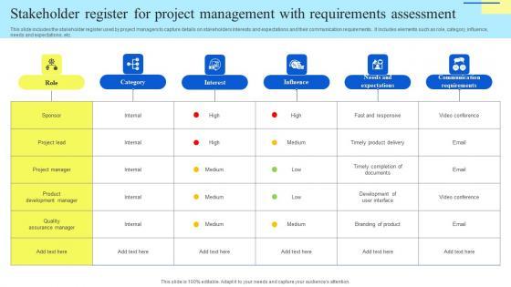 This slide includes the stakeholder register used by project managers to capture details on stakeholders interests and expectations and their communication requirements. It includes elements such as role, category, influence, needs and expectations, etc. Pitch your topic with ease and precision using this Stakeholder Register For Project Management With Requirements Assessment Ideas Pdf. This layout presents information on Stakeholder Register, Project Management, Requirements Assessment. It is also available for immediate download and adjustment. So, changes can be made in the color, design, graphics or any other component to create a unique layout. This slide includes the stakeholder register used by project managers to capture details on stakeholders interests and expectations and their communication requirements. It includes elements such as role, category, influence, needs and expectations, etc.
