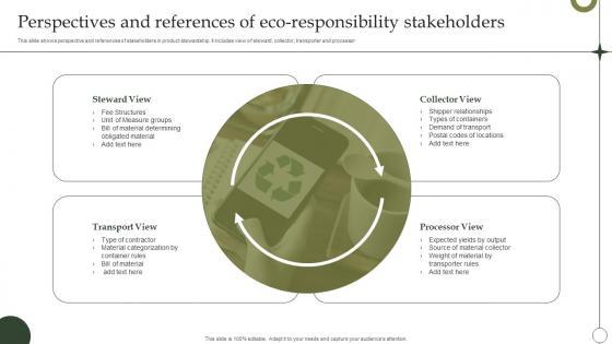 This slide shows perspective and references of stakeholders in product stewardship. It includes view of steward, collector, transporter and processor. Showcasing this set of slides titled Perspectives And References Of Eco Responsibility Stakeholders Summary Pdf. The topics addressed in these templates are Shipper Relationships, Eco Responsibility Stakeholders, Source Of Material Collector. All the content presented in this PPT design is completely editable. Download it and make adjustments in color, background, font etc. as per your unique business setting. This slide shows perspective and references of stakeholders in product stewardship. It includes view of steward, collector, transporter and processor.