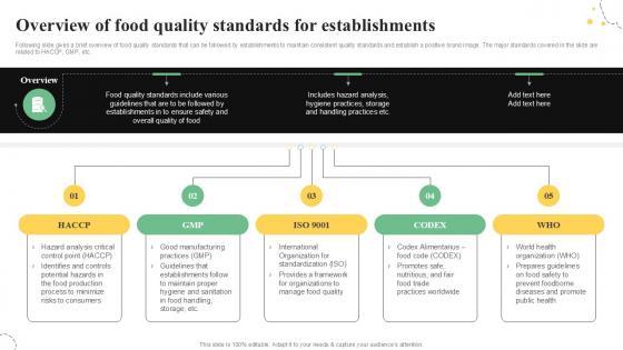 Following slide gives a brief overview of food quality standards that can be followed by establishments to maintain consistent quality standards and establish a positive brand image. The major standards covered in the slide are related to HACCP, GMP, etc. Do you know about Slidesgeeks Overview Of Food Quality Standards Quality Control Guide For Food PPT PowerPoint These are perfect for delivering any kind od presentation. Using it, create PowerPoint presentations that communicate your ideas and engage audiences. Save time and effort by using our pre-designed presentation templates that are perfect for a wide range of topic. Our vast selection of designs covers a range of styles, from creative to business, and are all highly customizable and easy to edit. Download as a PowerPoint template or use them as Google Slides themes. Following slide gives a brief overview of food quality standards that can be followed by establishments to maintain consistent quality standards and establish a positive brand image. The major standards covered in the slide are related to HACCP, GMP, etc.