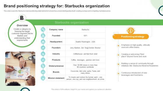 This slide covers the Starbucks brand positioning statement which shows how a brand distinguishes itself, creating a unique and compelling market presence. Boost your pitch with our creative Brand Positioning Strategy For Starbucks Types And Examples Of Product. Deliver an awe-inspiring pitch that will mesmerize everyone. Using these presentation templates you will surely catch everyones attention. You can browse the ppts collection on our website. We have researchers who are experts at creating the right content for the templates. So you do not have to invest time in any additional work. Just grab the template now and use them. This slide covers the Starbucks brand positioning statement which shows how a brand distinguishes itself, creating a unique and compelling market presence