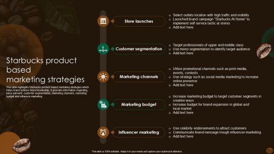 This slide highlights Starbucks product based marketing strategies which helps brand achieve brand leadership. It provides information regarding, place element, customer segmentation, marketing channels, marketing budget and influence marketing. Present like a pro with Starbucks Product Based Marketing Strategies Ppt Powerpoint SS. Create beautiful presentations together with your team, using our easy-to-use presentation slides. Share your ideas in real-time and make changes on the fly by downloading our templates. So whether you are in the office, on the go, or in a remote location, you can stay in sync with your team and present your ideas with confidence. With Slidegeeks presentation got a whole lot easier. Grab these presentations today. This slide highlights Starbucks product based marketing strategies which helps brand achieve brand leadership. It provides information regarding, place element, customer segmentation, marketing channels, marketing budget and influence marketing.