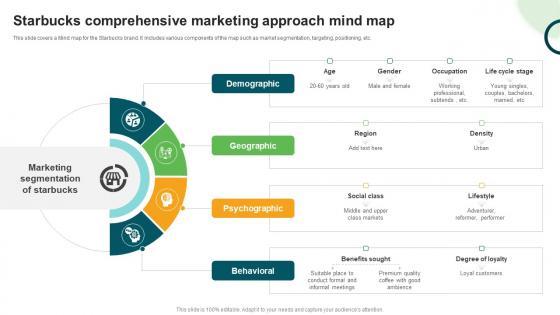 This slide covers a Mind map for the Starbucks brand. It includes various components of the map such as market segmentation, targeting, positioning, etc. Do you know about Slidesgeeks Types And Examples Of Product Starbucks Comprehensive Marketing Approach Mind Map These are perfect for delivering any kind od presentation. Using it, create PowerPoint presentations that communicate your ideas and engage audiences. Save time and effort by using our pre-designed presentation templates that are perfect for a wide range of topic. Our vast selection of designs covers a range of styles, from creative to business, and are all highly customizable and easy to edit. Download as a PowerPoint template or use them as Google Slides themes. This slide covers a Mind map for the Starbucks brand. It includes various components of the map such as market segmentation, targeting, positioning, etc.
