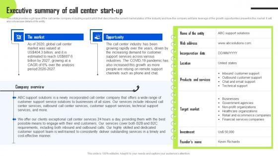 This slide provides a glimpse of the call center company including a quick pitch that describes the current market status of the industry and how the company will take leverage of the growth opportunities present in the market. It will also showcase details of its entity. The best PPT templates are a great way to save time, energy, and resources. Slidegeeks have 100 percent editable powerpoint slides making them incredibly versatile. With these quality presentation templates, you can create a captivating and memorable presentation by combining visually appealing slides and effectively communicating your message. Download Executive Summary Of Call Center Start Up IT And Tech Support Business Background Pdf from Slidegeeks and deliver a wonderful presentation. This slide provides a glimpse of the call center company including a quick pitch that describes the current market status of the industry and how the company will take leverage of the growth opportunities present in the market. It will also showcase details of its entity.