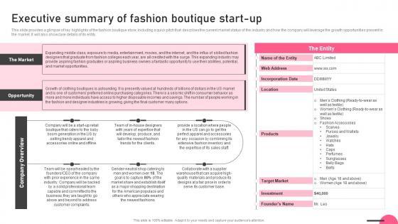 This slide provides a glimpse of key highlights of the fashion boutique store, including a quick pitch that describes the current market status of the industry and how the company will leverage the growth opportunities present in the market. It will also showcase details of its entity. If you are looking for a format to display your unique thoughts, then the professionally designed Executive Summary Of Fashion Boutique Start Up Boutique Business Infographics Pdf is the one for you. You can use it as a Google Slides template or a PowerPoint template. Incorporate impressive visuals, symbols, images, and other charts. Modify or reorganize the text boxes as you desire. Experiment with shade schemes and font pairings. Alter, share or cooperate with other people on your work. Download Executive Summary Of Fashion Boutique Start Up Boutique Business Infographics Pdf and find out how to give a successful presentation. Present a perfect display to your team and make your presentation unforgettable. This slide provides a glimpse of key highlights of the fashion boutique store, including a quick pitch that describes the current market status of the industry and how the company will leverage the growth opportunities present in the market. It will also showcase details of its entity.