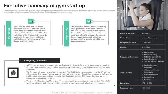 This slide provides a glimpse of the gym company including a quick pitch that describes the current market status of the industry and how the company will take leverage of the growth opportunities present in the market. It will also showcase details of its entity. If you are looking for a format to display your unique thoughts, then the professionally designed Executive Summary Of Gym Start Up Fitness Center Business Plan Slides Pdf is the one for you. You can use it as a Google Slides template or a PowerPoint template. Incorporate impressive visuals, symbols, images, and other charts. Modify or reorganize the text boxes as you desire. Experiment with shade schemes and font pairings. Alter, share or cooperate with other people on your work. Download Executive Summary Of Gym Start Up Fitness Center Business Plan Slides Pdf and find out how to give a successful presentation. Present a perfect display to your team and make your presentation unforgettable. This slide provides a glimpse of the gym company including a quick pitch that describes the current market status of the industry and how the company will take leverage of the growth opportunities present in the market. It will also showcase details of its entity.