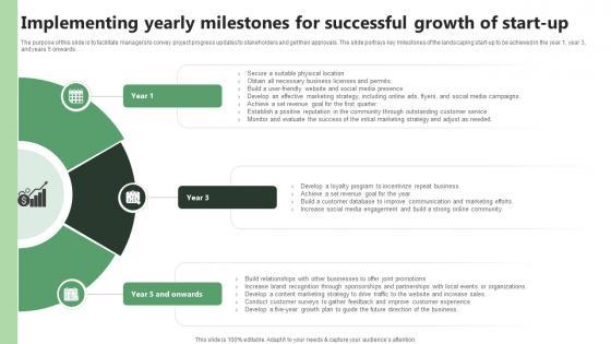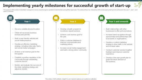 The purpose of this slide is to facilitate managers to convey project progress updates to stakeholders and get their approvals. The slide portrays key milestones of the landscaping start-up to be achieved in the year 1, year 3, and years 5 onwards. Crafting an eye-catching presentation has never been more straightforward. Let your presentation shine with this tasteful yet straightforward Implementing Yearly Milestones For Successful Growth Of Start Up Lawn Care BP SS V template. It offers a minimalistic and classy look that is great for making a statement. The colors have been employed intelligently to add a bit of playfulness while still remaining professional. Construct the ideal Implementing Yearly Milestones For Successful Growth Of Start Up Lawn Care BP SS V that effortlessly grabs the attention of your audience Begin now and be certain to wow your customers The purpose of this slide is to facilitate managers to convey project progress updates to stakeholders and get their approvals. The slide portrays key milestones of the landscaping start-up to be achieved in the year 1, year 3, and years 5 onwards.