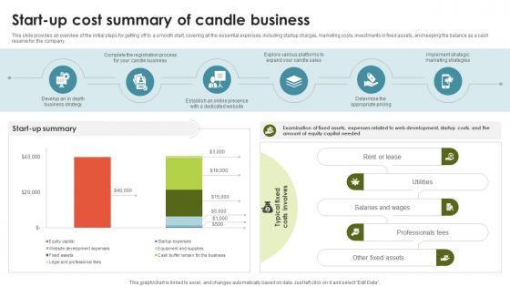 This slide provides an overview of the initial steps for getting off to a smooth start, covering all the essential expenses, including startup charges, marketing costs, investments in fixed assets, and keeping the balance as a cash reserve for the company. This Candle Business Venture Start Up Cost Summary Of Candle Business BP SS V from Slidegeeks makes it easy to present information on your topic with precision. It provides customization options, so you can make changes to the colors, design, graphics, or any other component to create a unique layout. It is also available for immediate download, so you can begin using it right away. Slidegeeks has done good research to ensure that you have everything you need to make your presentation stand out. Make a name out there for a brilliant performance. This slide provides an overview of the initial steps for getting off to a smooth start, covering all the essential expenses, including startup charges, marketing costs, investments in fixed assets, and keeping the balance as a cash reserve for the company.