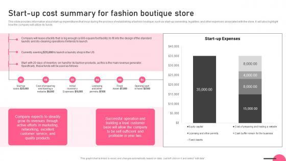 This slide provides information about start-up expenditures that incur during the process of establishing a fashion boutique, such as start-up ownership, legalities, and other expenses associated with the store. It will also highlight how the company will utilize its funds. Boost your pitch with our creative Start Up Cost Summary For Fashion Boutique Store Boutique Business Information Pdf. Deliver an awe-inspiring pitch that will mesmerize everyone. Using these presentation templates you will surely catch everyones attention. You can browse the ppts collection on our website. We have researchers who are experts at creating the right content for the templates. So you do not have to invest time in any additional work. Just grab the template now and use them. This slide provides information about start-up expenditures that incur during the process of establishing a fashion boutique, such as start-up ownership, legalities, and other expenses associated with the store. It will also highlight how the company will utilize its funds.