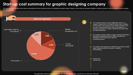 This slide provides information about start-up expenditures that incur during the process of establishing a graphic design company, such as start-up ownership, legalities, and other expenses. It will also highlight how the company will utilize its funds. Presenting this PowerPoint presentation, titled Start Up Cost Summary For Graphic Sample Pentagram Business Plan PPT Sample BP SS V, with topics curated by our researchers after extensive research. This editable presentation is available for immediate download and provides attractive features when used. Download now and captivate your audience. Presenting this Start Up Cost Summary For Graphic Sample Pentagram Business Plan PPT Sample BP SS V. Our researchers have carefully researched and created these slides with all aspects taken into consideration. This is a completely customizable Start Up Cost Summary For Graphic Sample Pentagram Business Plan PPT Sample BP SS V that is available for immediate downloading. Download now and make an impact on your audience. Highlight the attractive features available with our PPTs. This slide provides information about start-up expenditures that incur during the process of establishing a graphic design company, such as start-up ownership, legalities, and other expenses. It will also highlight how the company will utilize its funds.