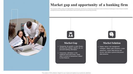 The purpose of this slide is to highlight the market gap and focus on devising solutions to overcome those challenges. It also helps to identify unexplored areas that other businesses in the same space are not serving currently. Welcome to our selection of the Market Gap And Opportunity Of A Banking Firm Banking Start Up B Plan Go To Market Strategy Slides Pdf. These are designed to help you showcase your creativity and bring your sphere to life. Planning and Innovation are essential for any business that is just starting out. This collection contains the designs that you need for your everyday presentations. All of our PowerPoints are 100 percent editable, so you can customize them to suit your needs. This multi purpose template can be used in various situations. Grab these presentation templates today The purpose of this slide is to highlight the market gap and focus on devising solutions to overcome those challenges. It also helps to identify unexplored areas that other businesses in the same space are not serving currently.