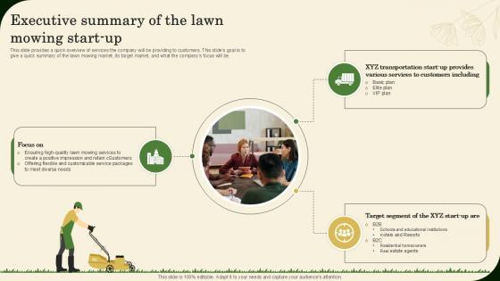 This slide provides a quick overview of services the company will be providing to customers. This slides goal is to give a quick summary of the lawn mowing market, its target market, and what the companys focus will be. Whether you have daily or monthly meetings, a brilliant presentation is necessary. Executive Summary Of The Lawn Mowing Start Up Landscaping Business Plan Ppt Sample BP SS V can be your best option for delivering a presentation. Represent everything in detail using Executive Summary Of The Lawn Mowing Start Up Landscaping Business Plan Ppt Sample BP SS V and make yourself stand out in meetings. The template is versatile and follows a structure that will cater to your requirements. All the templates prepared by Slidegeeks are easy to download and edit. Our research experts have taken care of the corporate themes as well. So, give it a try and see the results. This slide provides a quick overview of services the company will be providing to customers. This slides goal is to give a quick summary of the lawn mowing market, its target market, and what the companys focus will be.